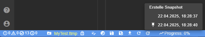Um den Datenverlust bei Fehlbedienungen oder Programmabstürzen zu minimieren, wurde ein Snapshot-Mechanismus hinzugefügt. Falls vom Nutzer gewünscht, wird periodisch ein Snapshot des aktuellen Projekts erzeugt. Das Intervall (standardmäßig alle fünf Minuten) und die Anzahl zwischengespeicherter Snapshots (standardmäßig drei Snapshots) kann in den Tool-Einstellungen festgelegt werden. Zusätzlich können Snapshots angepinnt werden. Diese werden nicht beim nächsten Speichern gelöscht.