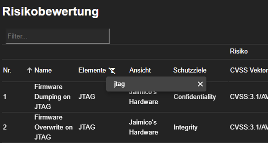 In der Übersicht aller Angriffsszenarien (Seite „Risk“) kann nun ein Filter einzeln für die jeweilige Spalte hinzugefügt werden. Dies ermöglicht beispielsweise danach zu filtern, welche Szenarien keine Maßnahme zugewiesen haben.